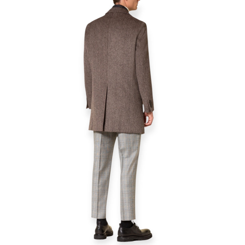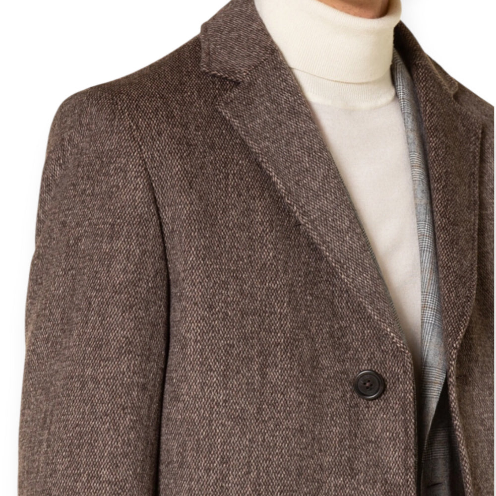 - Ανδρικό ημίπαλτο σε καφέ μελάνς απόχρωση με αποσπώμενη μόστρα, μονόπετο με δυο εξωτερικές τσέπες και δυο εσωτερικές. Πλήρως φοδραρισμένο. Το μήκος του φτάνει πάνω από το γόνατο.