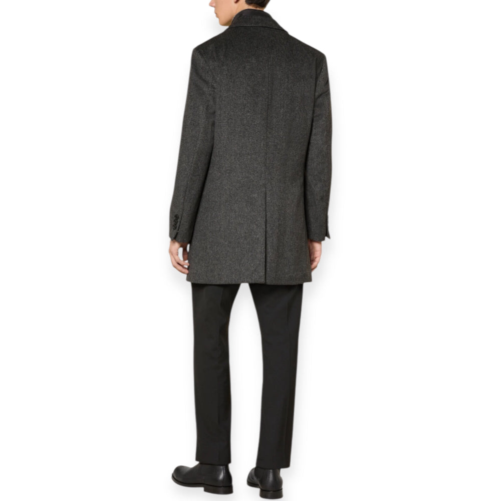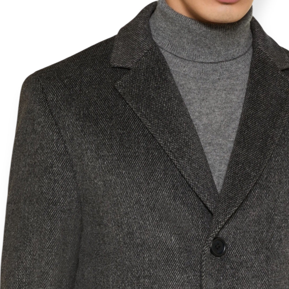 - Ανδρικό ημίπαλτο σε σκούρα γκρι απόχρωση , με μικροσχέδιο στην ύφανση και εσωτερική αποσπώμενη μόστρα. Δυο εξωτερικές τσέπες και δυο εσωτερικές, To μήκος του παλτό είναι πάνω από το γόνατο. Είναι πλήρως φοδραρισμένο.
