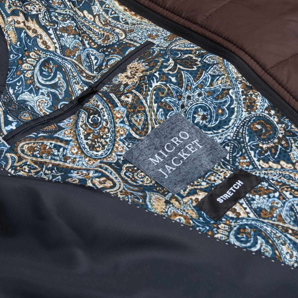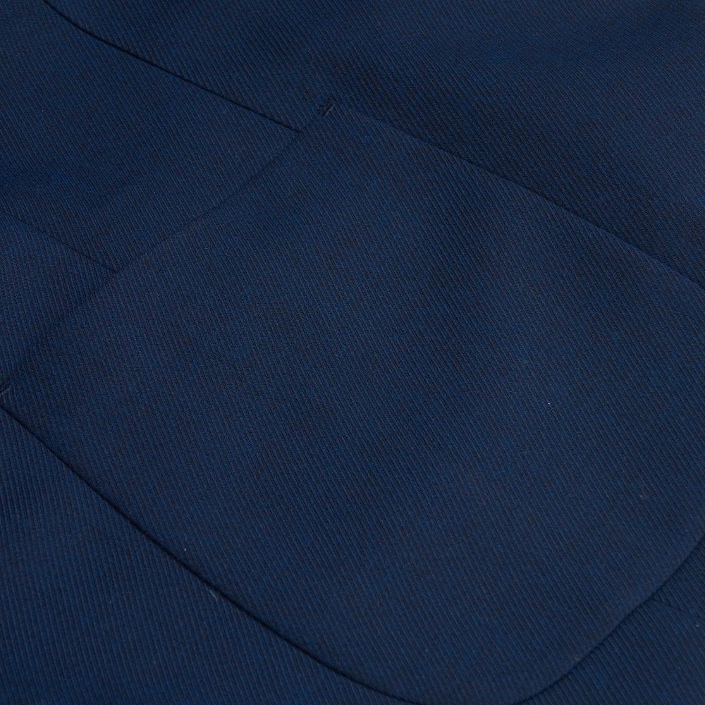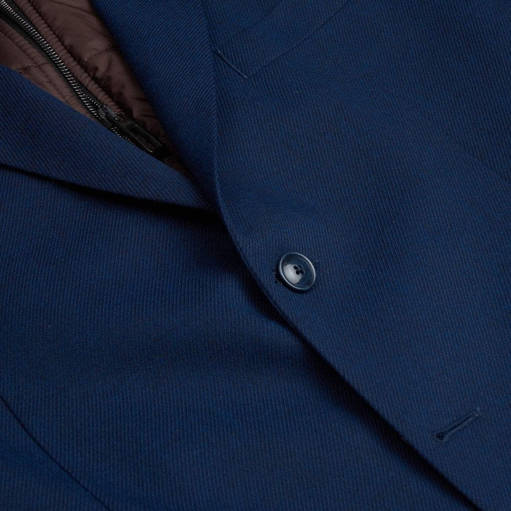 Ανδρικό σακάκι (Blazer) σε  μπλε απόχρωση. Το σακάκι είναι μονόπετο δίκουμπο με καφέ αποσπώμενη μόστρα μπροστά (κλείνει με φερμουάρ). Οι τσέπες του είναι ανοιχτές (patch pockets) και είναι πλήρως φοδραρισμένο. Διαθέτει 2 ανοίγματα πίσω.